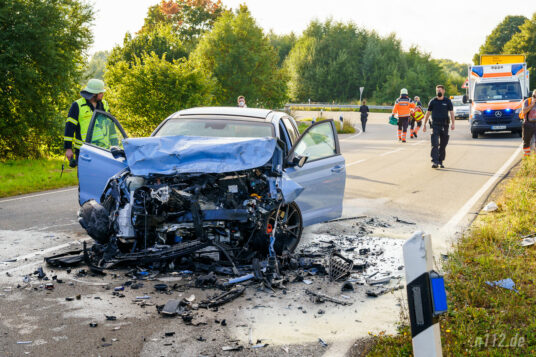 Nach ersten Angaben der Polizei war ein Audi-Fahrer an der Einmündung der A2 in Richtung Hannover nach links abgebogen und hatte einen entgegenkommenden VW Lupo übersehen.