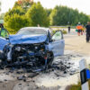 Die Front des Mustangs wurde dabei komplett aufgerissen, anschließend schleuderte das Auto nach rechts in den Grünstreifen.